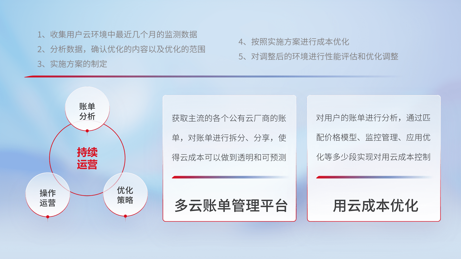 通过多云纳管,,,以统一的资源数据模型把客户的云资源进行抽象和封装,,进而实现对多云资源的统一操作,,,保障云资源管理的可靠性、、、稳定性与可用性。。。。量身定制化运维内容,,,配置、、、、开发运维、、、补丁管理、、备份、、、监控、、、认证和访问管理、、、审计和日常巡检等,,保障在用云过程中的可靠度,,,稳定度以及高可用率。。。